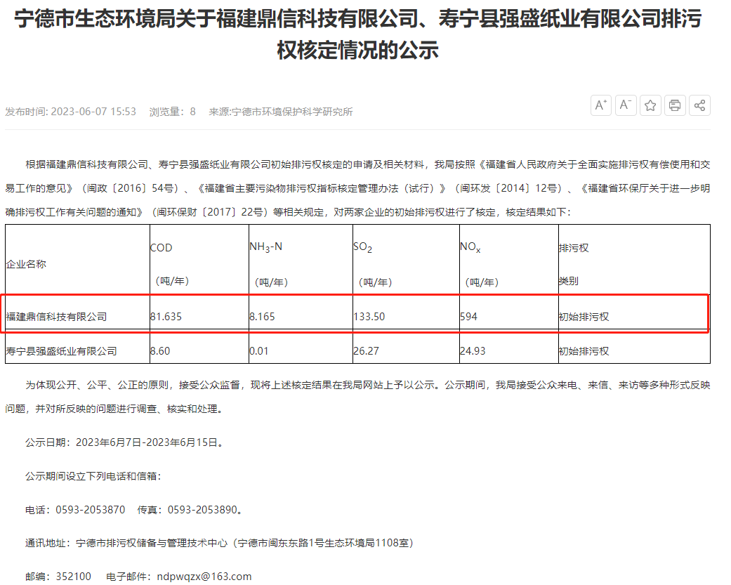 6月7日,寧德市生態環境局就福建鼎信科技有限公司排污權核定情況對外進行公示, 公示日期:2023年6月7日-2023年6月15日。