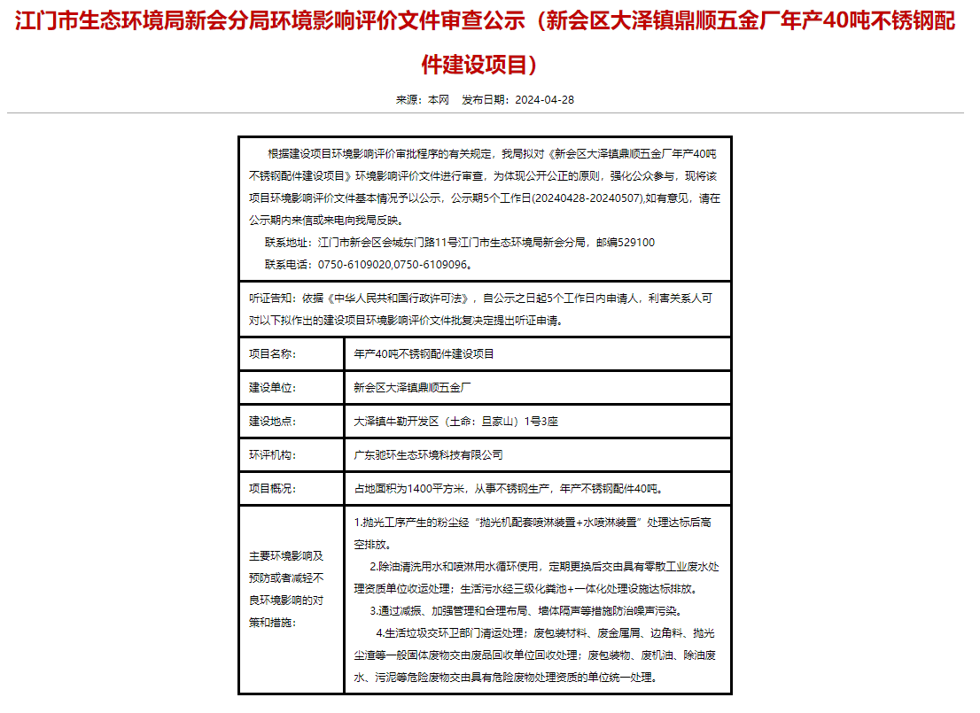 4月28日,江門(mén)市生態(tài)環(huán)境局新會(huì)分局就新會(huì)區(qū)大澤鎮(zhèn)鼎順五金廠年產(chǎn)40噸不銹鋼配件建設(shè)項(xiàng)目環(huán)境影響評(píng)價(jià)文件進(jìn)行審查公示,公示期5個(gè)工作日(20240428-20240507)。