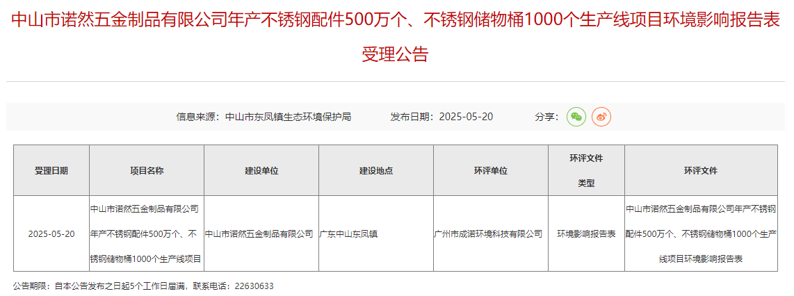 2025年5月20日,中山市東鳳鎮生態環境保護局受理中山市諾然五金制品有限公司年產不銹鋼配件500萬個、不銹鋼儲物桶1000個生產線項目環境影響報告表并對外進行公告,公告期:5個工作日。