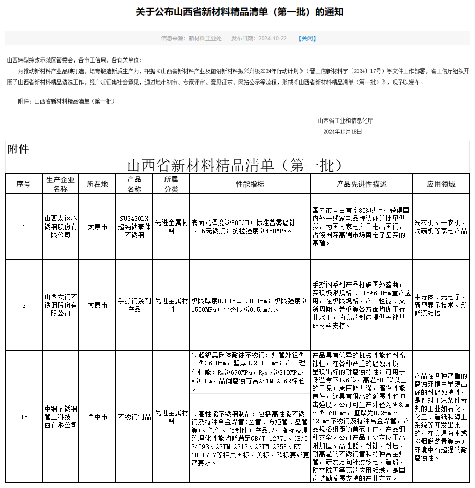據清單顯示,山西太鋼不銹鋼股份有限公司SUS430LX超純鐵素體不銹鋼、手撕鋼系列產品和中綱不銹鋼管業科技山西有限公司不銹鋼制品均入選。