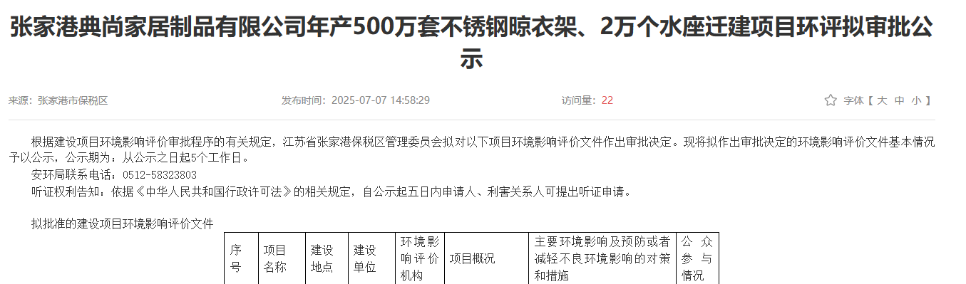 2025年7月7日,張家港典尚家居制品有限公司年產(chǎn)500萬套不銹鋼晾衣架、2萬個水座遷建項目環(huán)評獲審批公示,公示期:5個工作日。